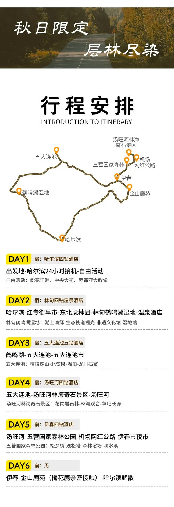 D6:伊春-金山鹿苑-(74km,车程约1.5h)-哈尔滨解散(350km,车程约5h)