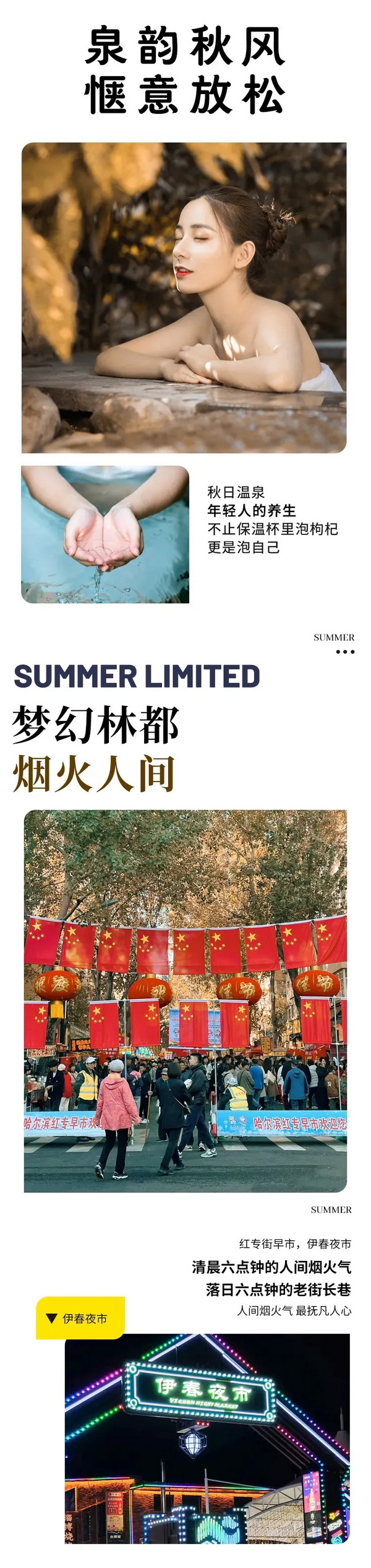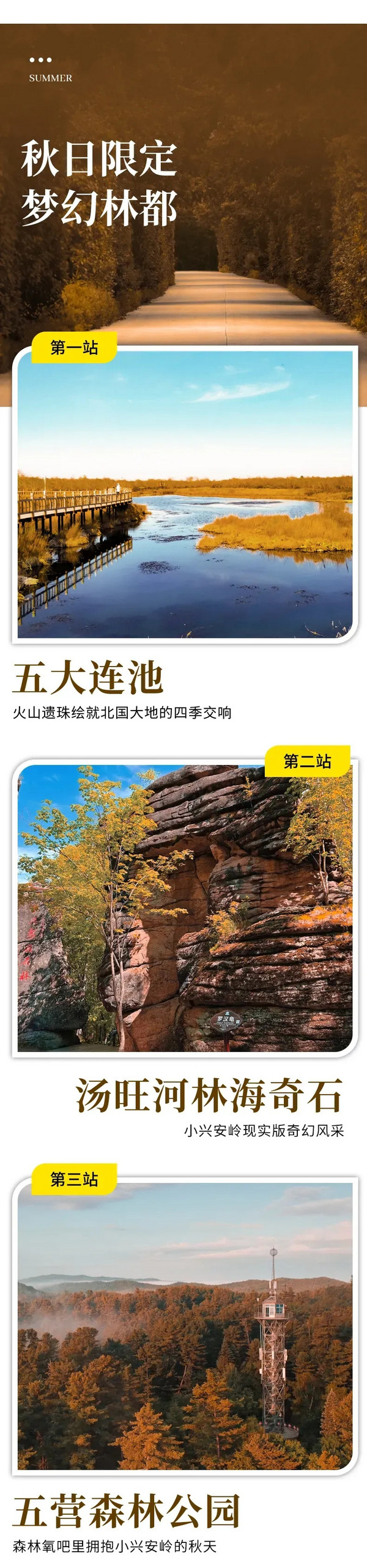 D5:汤旺河-五营国家森林公园(松乡桥-观松塔-森林浴场-响水溪)(66km,车程约1h)-机场网红公路-伊春市夜市(96km,车程约1.5h)