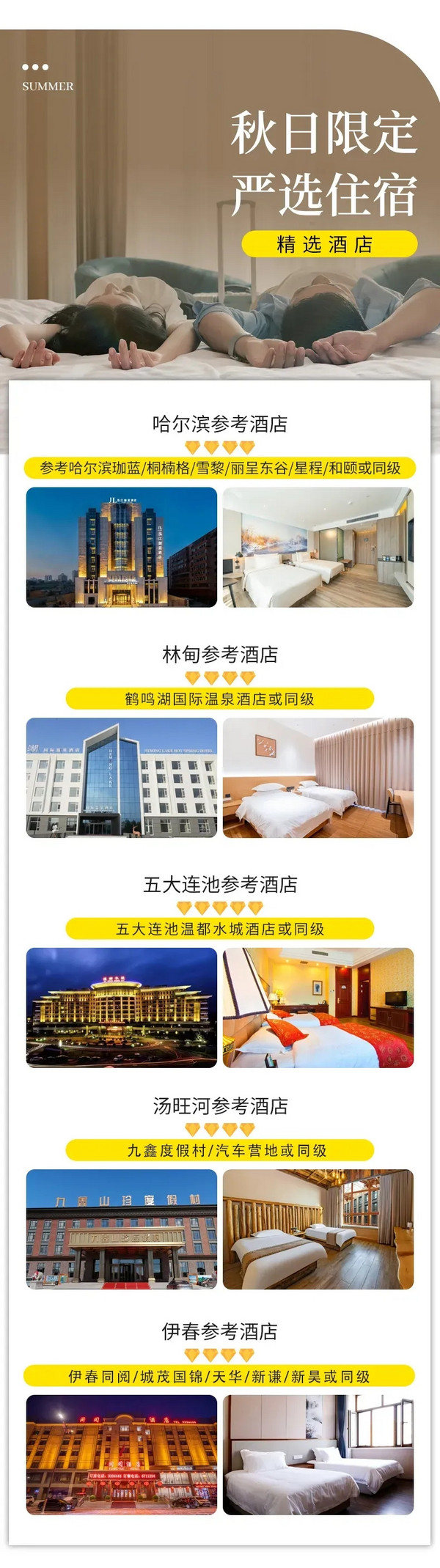 备注:钻级标准参考携程钻级标准,东北经济发展较差,酒店已经是我们精心挑选的,但是和大城市同级别酒店相比各方面略差一些,敬请您谅解;
