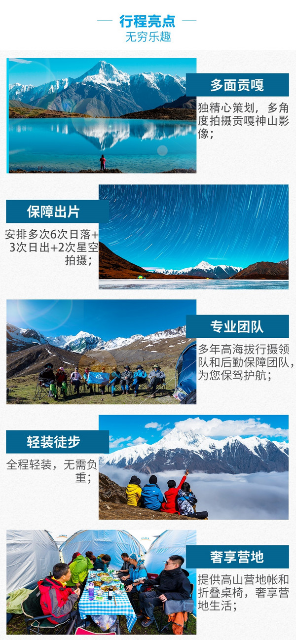 线路名称:【环贡嘎行摄】360度环贡嘎8日徒步摄影之旅:牛背山+冷噶错+里索海+子梅垭口+泽仁崩增+贡嘎梳妆台。