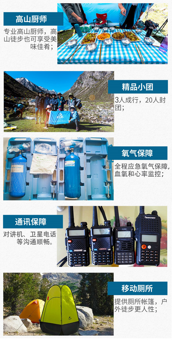 5、行李运输:全程轻装,有车辆或马帮负责公共物资和个人行李运输,贵重和易碎物品随身携带;6.公共装备:提供炊事帐篷、餐厅帐篷、厨具、桌子、椅子、对讲机、卫星电话、医用氧气瓶等器材。