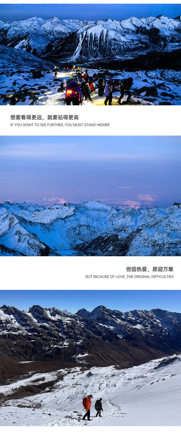 提供装备使用:冰爪+雪套+登山杖+头灯(需自备电池)。