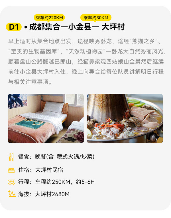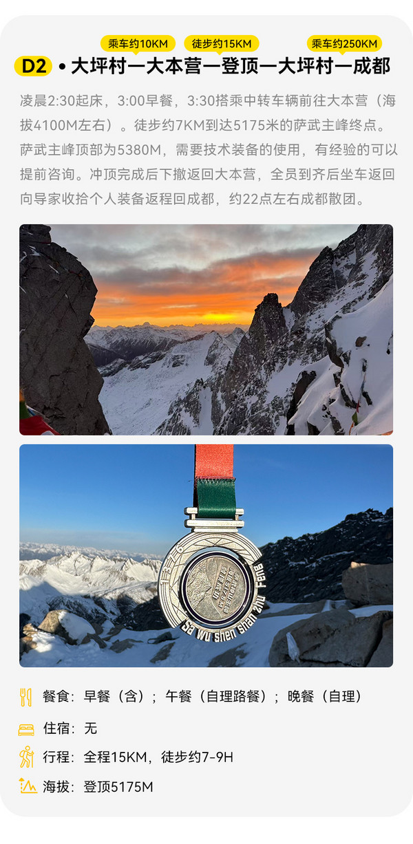 1.交通:成都出发根据人数选择合适车型,一人一座,大坪村-萨武神山大本营中转车。