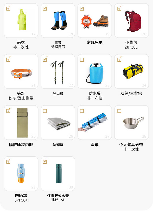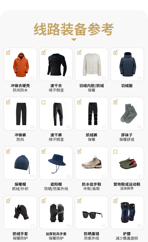 2、冲锋衣裤,排汗内衣裤,羽绒服,保暖内衣裤,高帮登山鞋、保暖排汗袜、保暖帽。