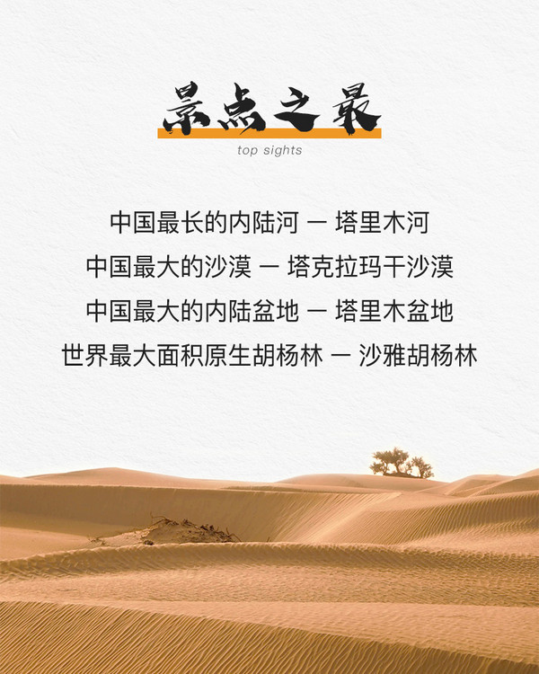 早餐后出发,穿越塔克拉玛干沙漠腹地前往阿拉尔,沿途可见流动沙丘、千年胡杨等独特沙漠景观。“没有荒凉的沙漠,只有荒凉的人生”等励志标语,传递戍边精神与生命力量。两侧设有观景平台,可登高拍摄浩瀚沙海。沿路边选安全地带徒步5-8公里,到达阿热勒服务区修整后,前往兵团新城阿拉尔。