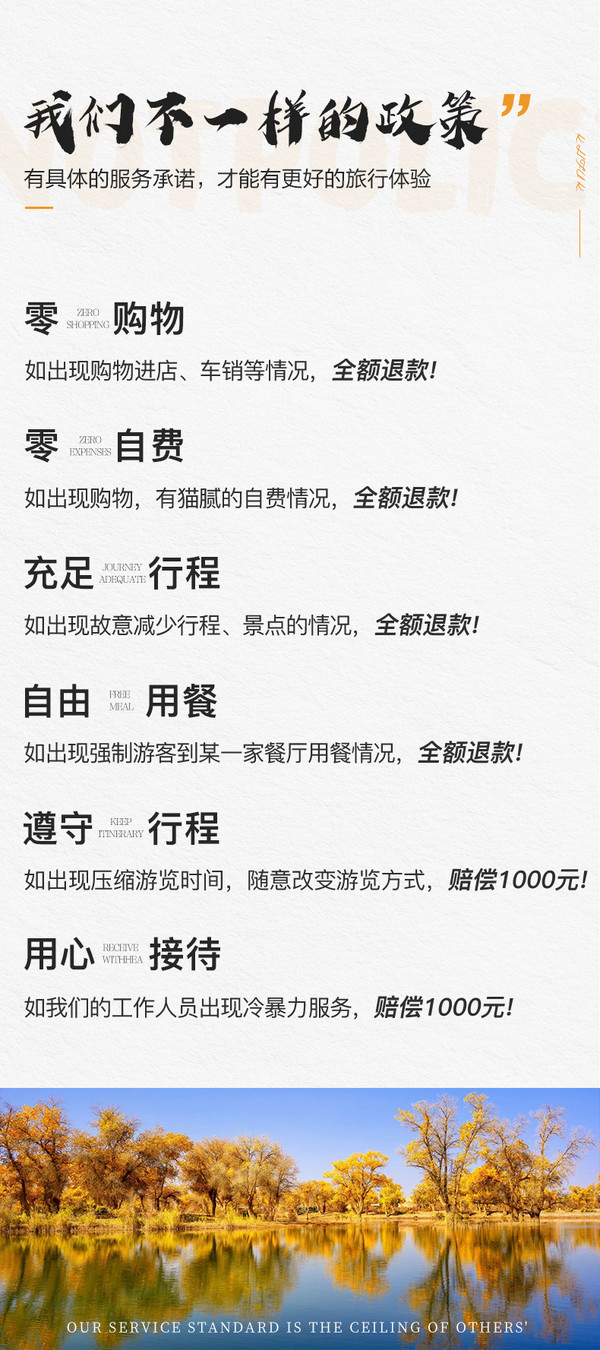 5、我们的活动保证纯玩无购物,如在活动进行中,因个人原因在景区、餐厅、体息区等地的购物场所消费,我们需要提醒您:理性消费并索要凭证,如产生消费争议,将由您与售卖商品的商家自行解决。