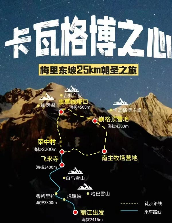 从梅里雪山脚下的荣中村出发。在短短三天时间内,欣赏梅里雪山腹地的日月与星空。