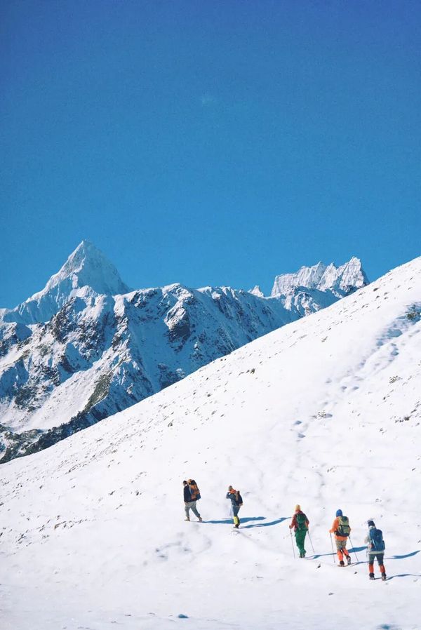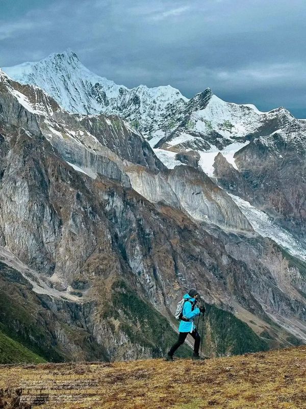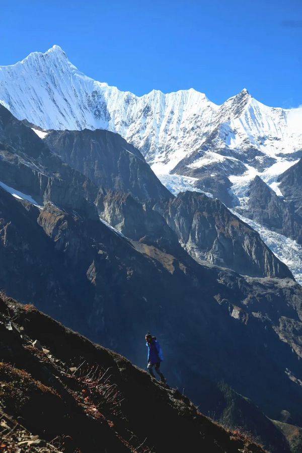 行走在山脊线上,以更开阔、直观的视角欣赏梅里的壮美,雪峰与古冰川的遗迹仿佛近在咫尺。