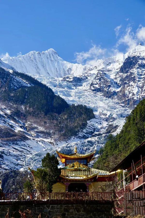 穿越卡瓦格博的疆域,从原始森林的豁口中撞见偌大如长河般的明永冰川从卡瓦格博脚下一路咆哮向大地村庄……