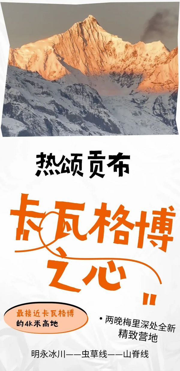 在卡瓦格博身旁栖息一晚后,我们途经去年新晋的虫草线路线,继续以罕见视角观赏梅里群峰(神女峰、将军峰、吉娃仁安以及雨崩冰湖上方的绝美冰川)……