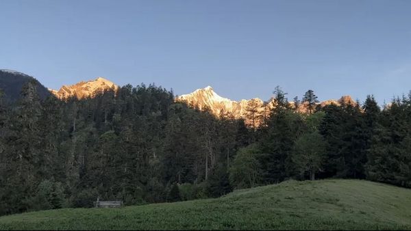 ● 南主牧场营地视角,可远眺密林之外的卡瓦格博和其他梅里雪峰;以及清晨美轮美奂的日照金山