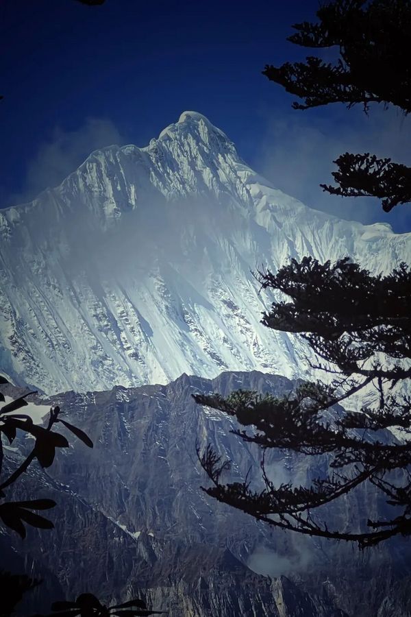 从第二天开始的原始森林穿越中,我们将不时在密林的豁口中瞥见卡瓦格博若隐若现的身姿,以及巨大的明永冰川横亘在山谷与坡地之上。