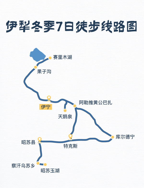 如遇气温原因,赛里木湖冰层没有冰冻结实,无法安全徒步穿越,改为徒步松树头登高往返3-4公里。