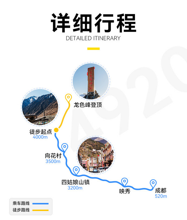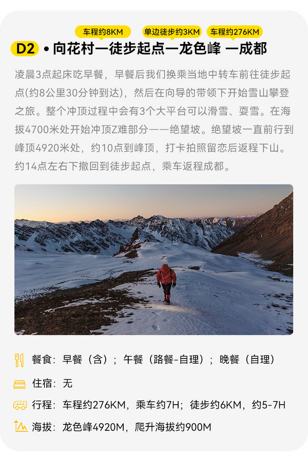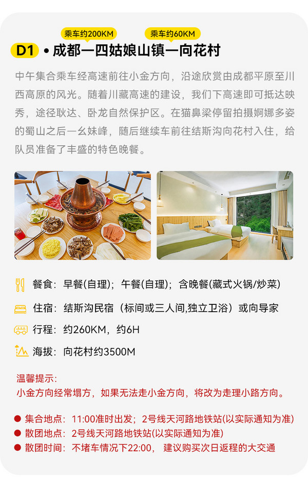 1.交通:成都出发根据人数选择合适车型,一人一座。(其中包括结斯沟龙色峰中转车);
