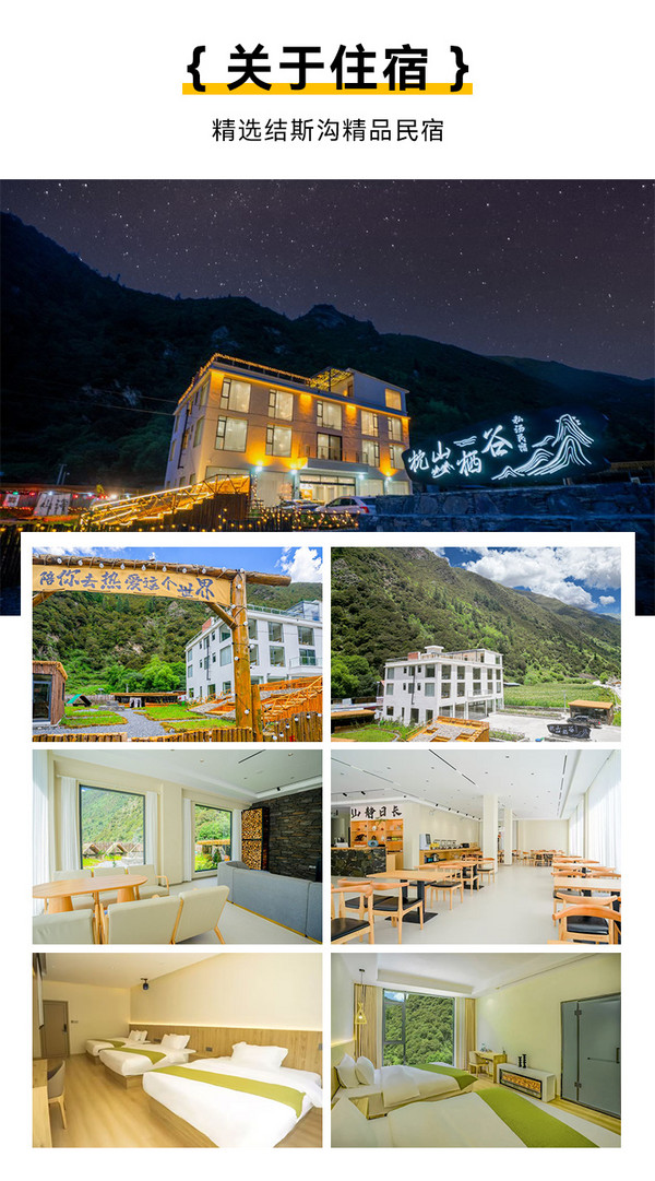 2.住宿:按行程所列标准入住。(其中:①结斯沟住宿一晚(标间或三人间);②单独参加我们散客拼团活动,结斯沟民宿默认与其他同性拼房,如果拼房不成功,需补单房差160元/人。