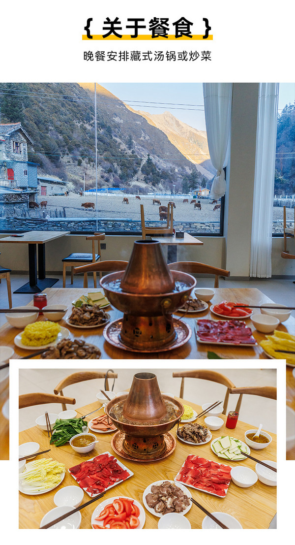 3.餐食:全程所列餐食合计1正1早,包含藏家晚餐早餐,晚餐为藏式汤锅或炒菜,早餐为粥、大饼、榨菜、清炒蔬菜等;