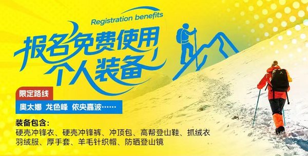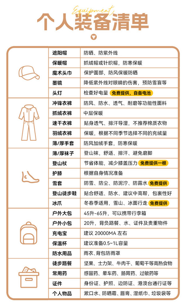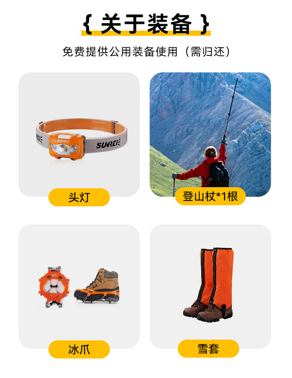 6.免费提供公共装备:冰爪,雪套,头灯,登山杖*1。